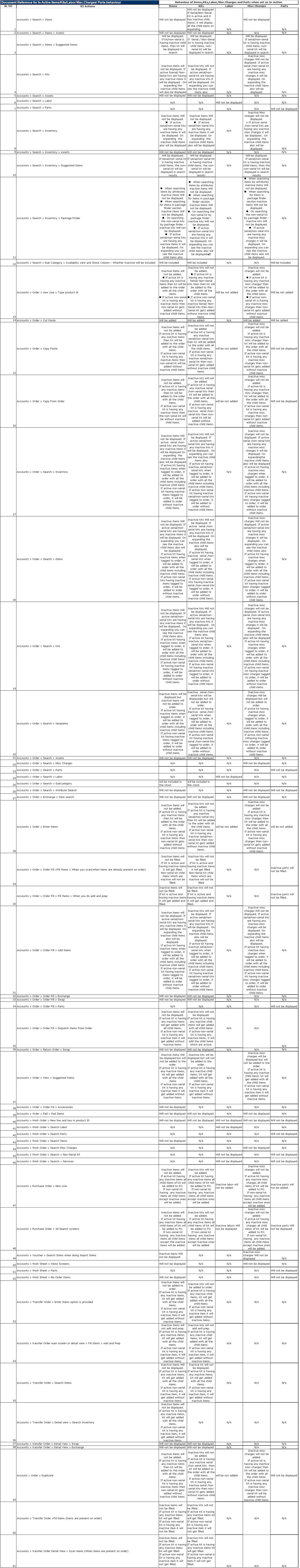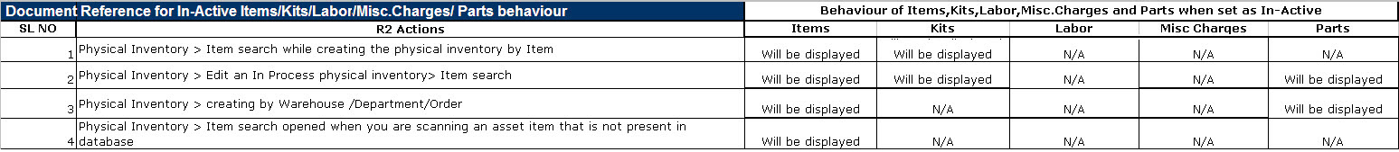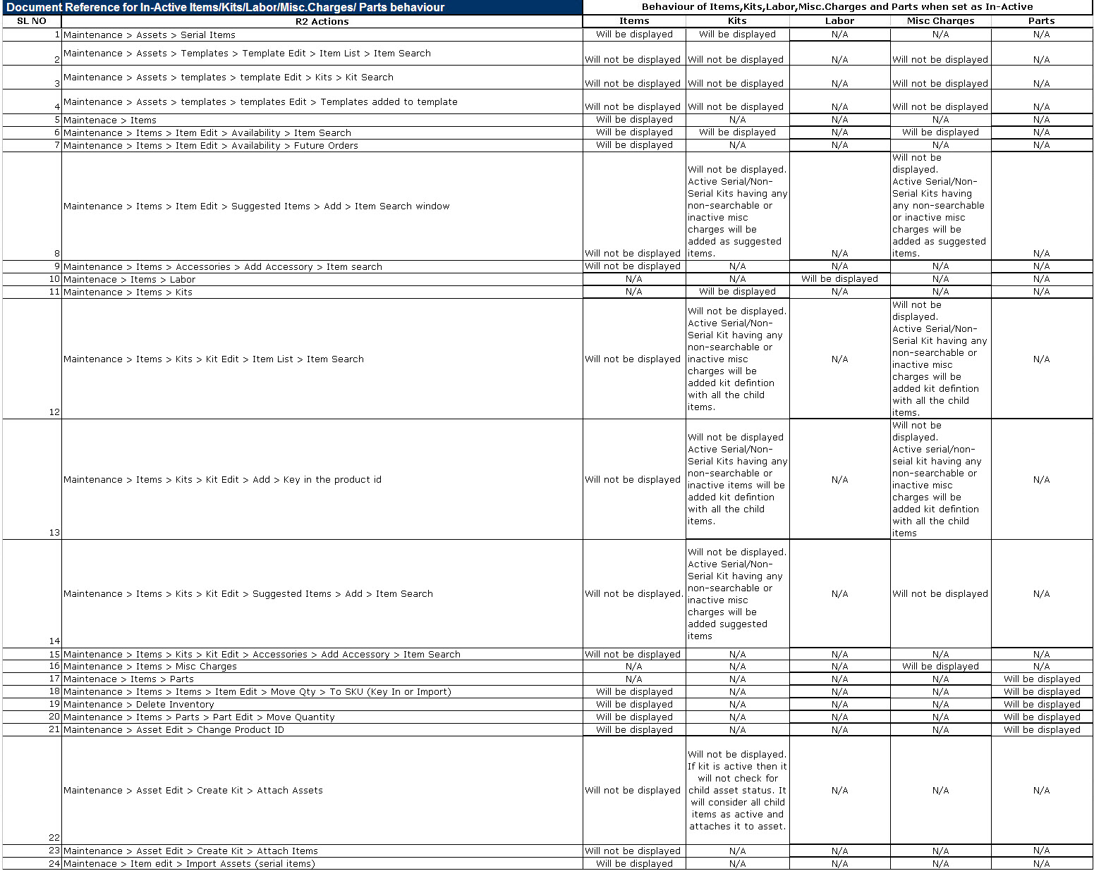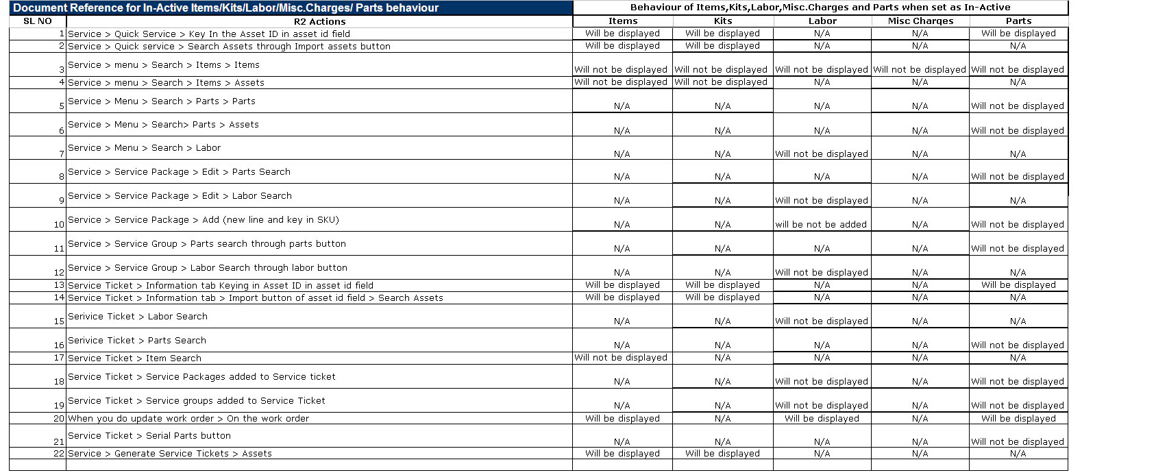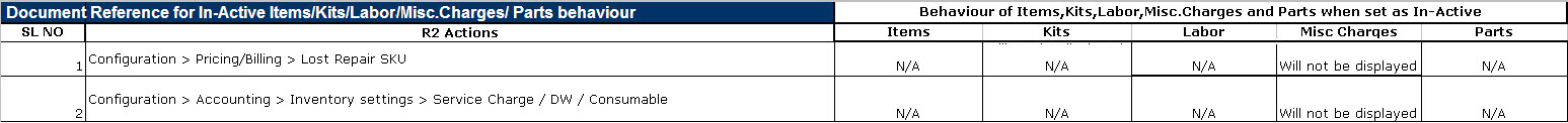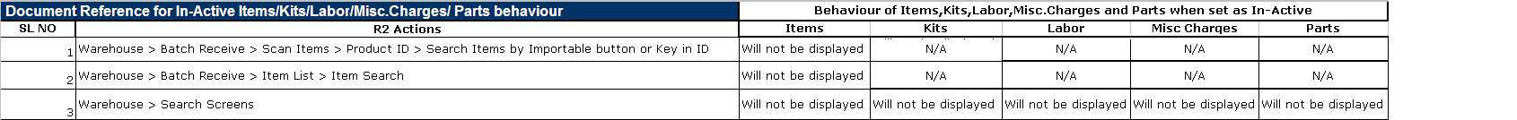 The R2 action reference for Inactive Items/ Kits/ Labor/ Misc. Charges/ Parts behavior has been classified based on the affected modules. Click on a module name to view the actions and the functionality implemented.