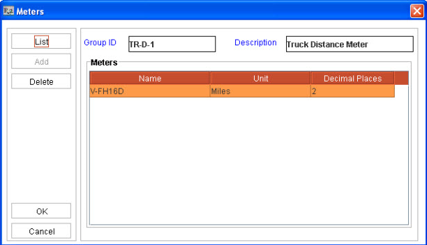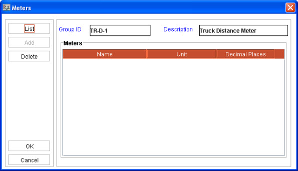 R2 displays the 'Meters' window, where in you can add / modify / delete existing definitions and also search and tag meter definitions to the meter group.