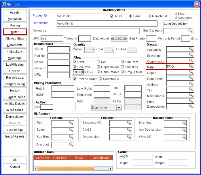 Meter definition can be tagged to an Item by selecting a meter group to the item.