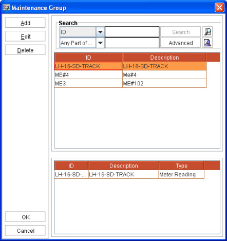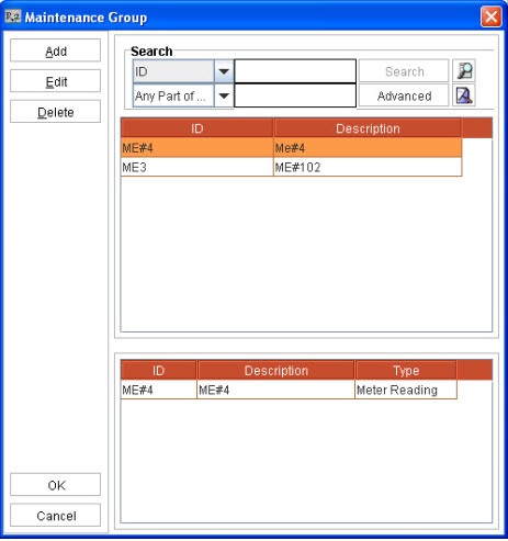 The Maintenance Group window displays all the existing maintenance group records. The bottom part of the window displays the details of the selected maintenance group record.