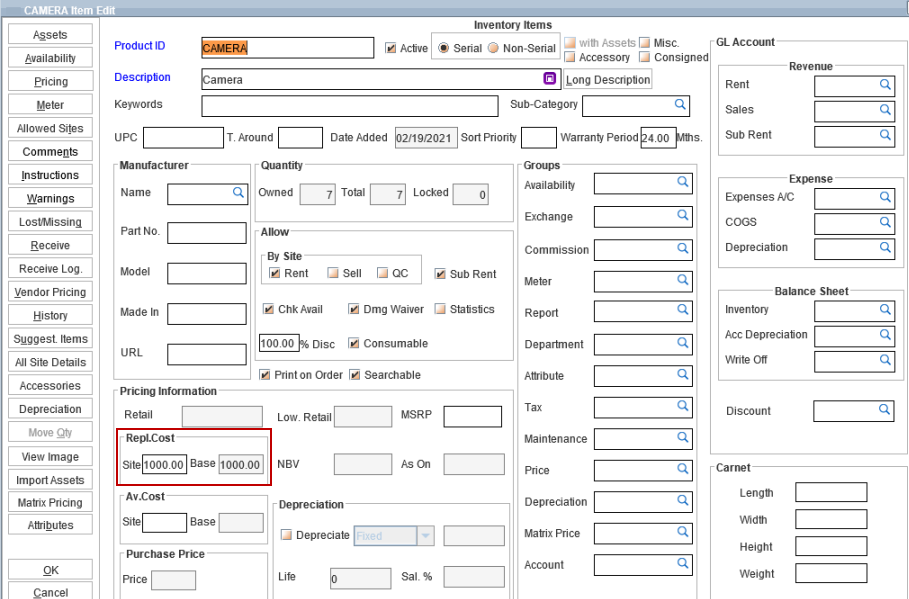 In Item edit window, two new fields are added (as shown below) wherein the user can enter the Site Currency and Base Currency based replacement cost.