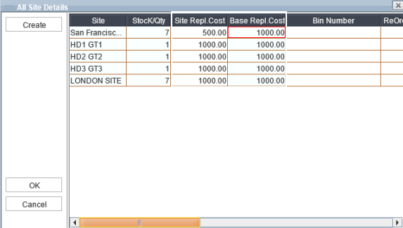 On selecting the create button, the Site Repl. Cost 100 is defaulted for the item to the sites in which replacement cost is not defined.