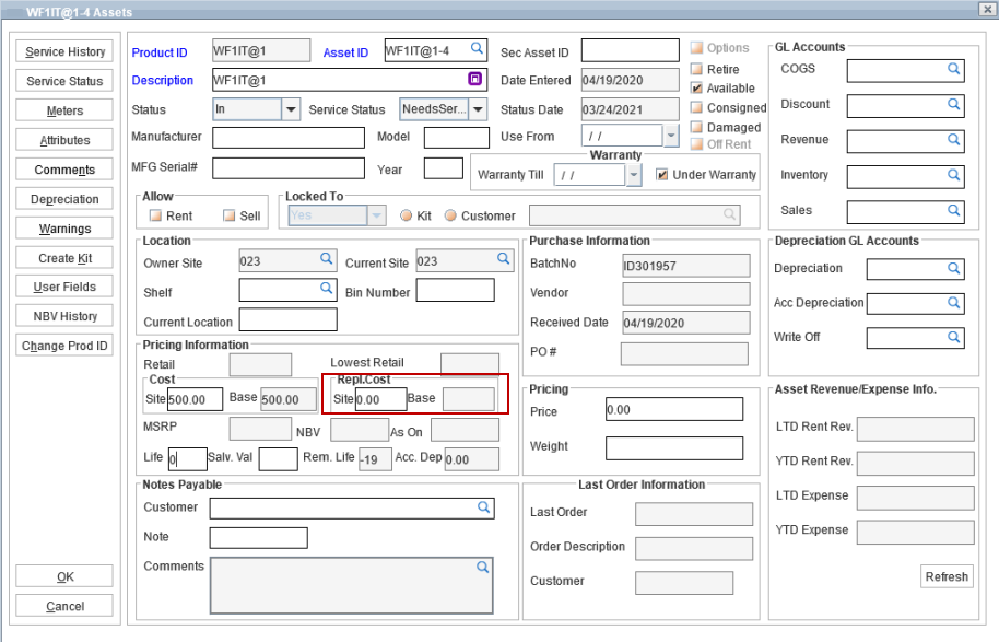 In 'Asset edit' window, two new fields (Site and Base have been given) under the category Repl. Cost, using which the user can define Replacement Cost based on Site currency and Base Currency for individual assets.