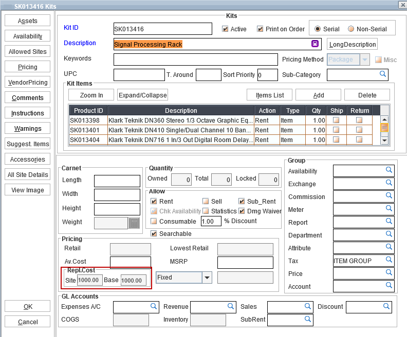 In 'Kit edit' window, two new fields have been added (as highlighted below), which will display the Site Currency based Replacement Cost and Base Currency Based Replacement cost for the items which are added to the Kit/Package.