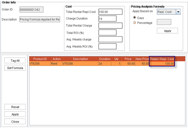 On applying Pricing Analysis Formula , if any Replacement Cost is defined for the current site, the same is updated in the Retail/Repl. Cost.
