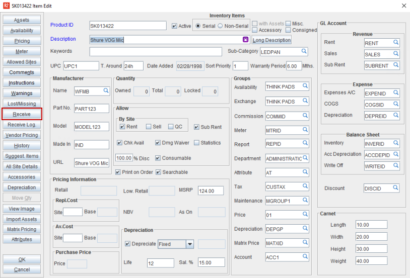 For serial items, select either Auto, User Defined, or Auto Seed which determines the mode by which Asset ID sequence will be generated.