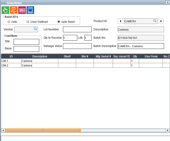 Displays the Asset ID based on the value you provided in Qty to receive field in scan item window |